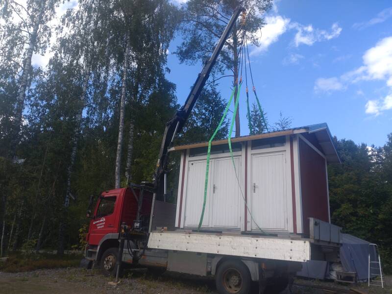 Tässä asiakkaalla oli muutto käynnissä ja pihavajan toivottiin saavan mukaan uuteen osoitteeseen. Pienellä valmistelulla se saatiin siirrettyä. Samalla ajettiin myös toinen reissu, kun oli nosturilla näppärästi nosteltavaa tavaraa.