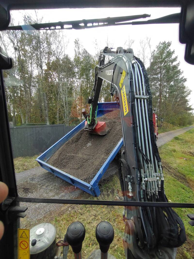 Tällä työmaalla kuorittiin/täytettiin maata kivetystä varten. Hieman myös mullalla tasoitettiin ympäröivän maan korkeuseroa.