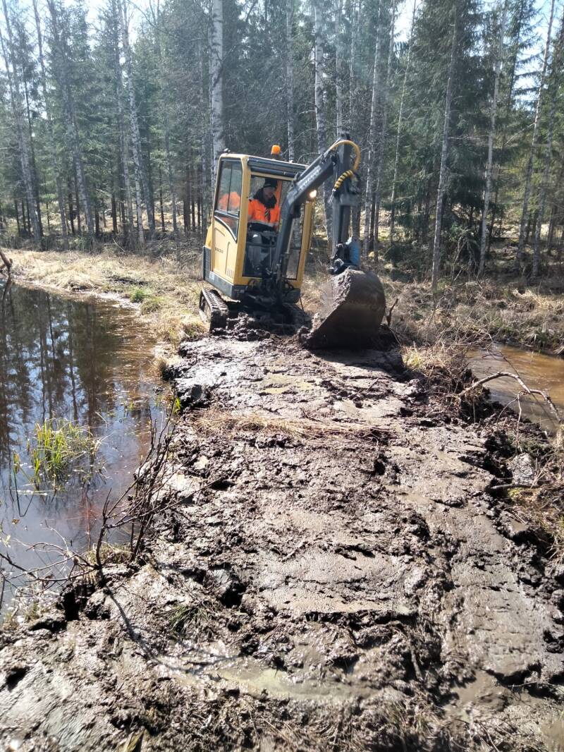 Mökin tekolammen pato oli ajan saatossa hukannut tavaraa ja näin ollen pienilläkin sateilla vesi tulvi yli ja pahensi tilannetta entisestään. Näinkin pieni kone meinasi painua, mutta padon reuna saatiin onnistuneesti korotettua.