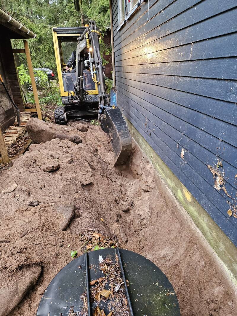 Tällä mökillä ei "oikea" kaivinkone ollut mahtunu kaivamaan uraa loppuun asti joten käytiin meidän pikkukoneella hoitamassa loppuun. Sen verran isoja kivi löytyi, että onneksi isäntä tarttui lapion sijasta puhelimeen.